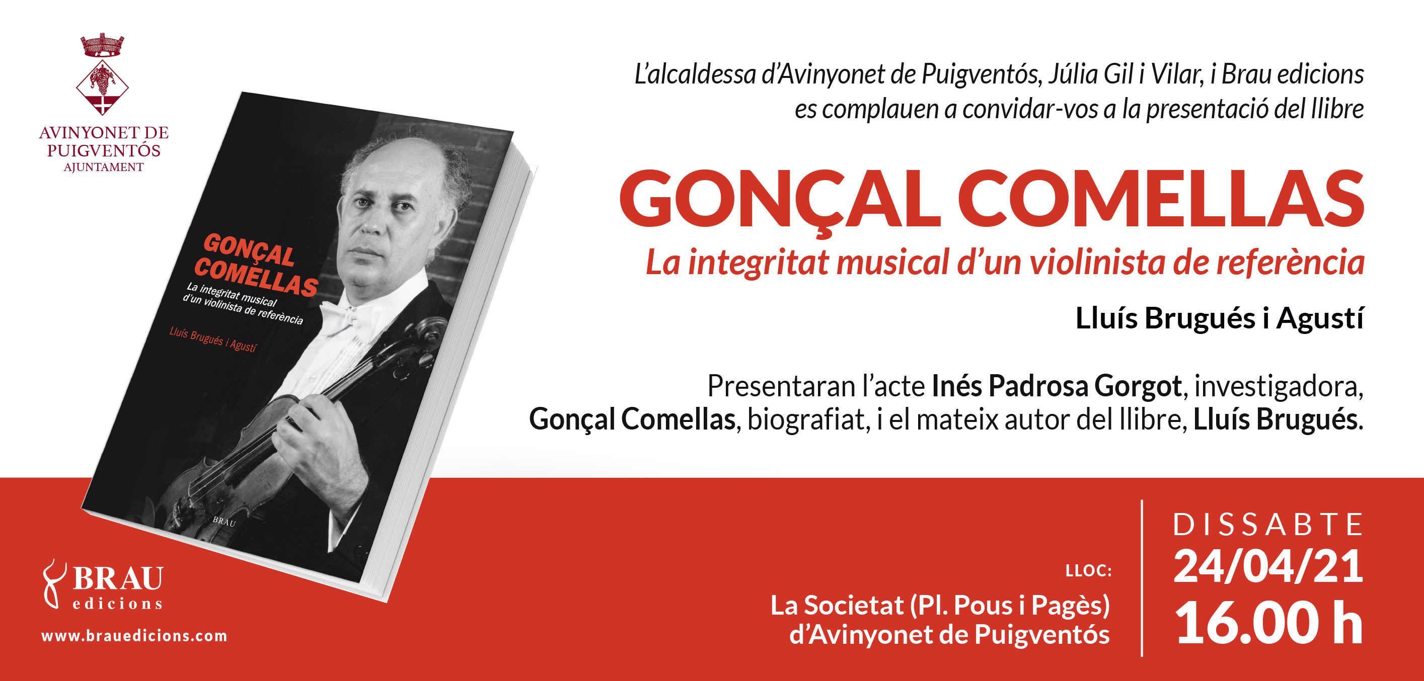 Ens complau convidar-vos a la presentació del llibre "Gonçal Comellas. La integritat musical d'un violonista de referència" de Lluís Brugués i Agustí. L’acte tindrà lloc el proper dissabte 24 d'abril, a les 16h, a la Sala de la Societat d'Avinyonet de Puigventós.