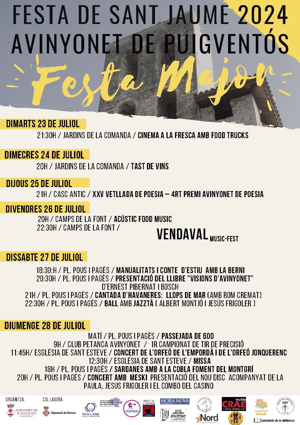 Ens plau convidar-vos a la Festa de Sant Jaume d’Avinyonet de Puigventós que tindrà lloc del 23 al 28 de juliol.