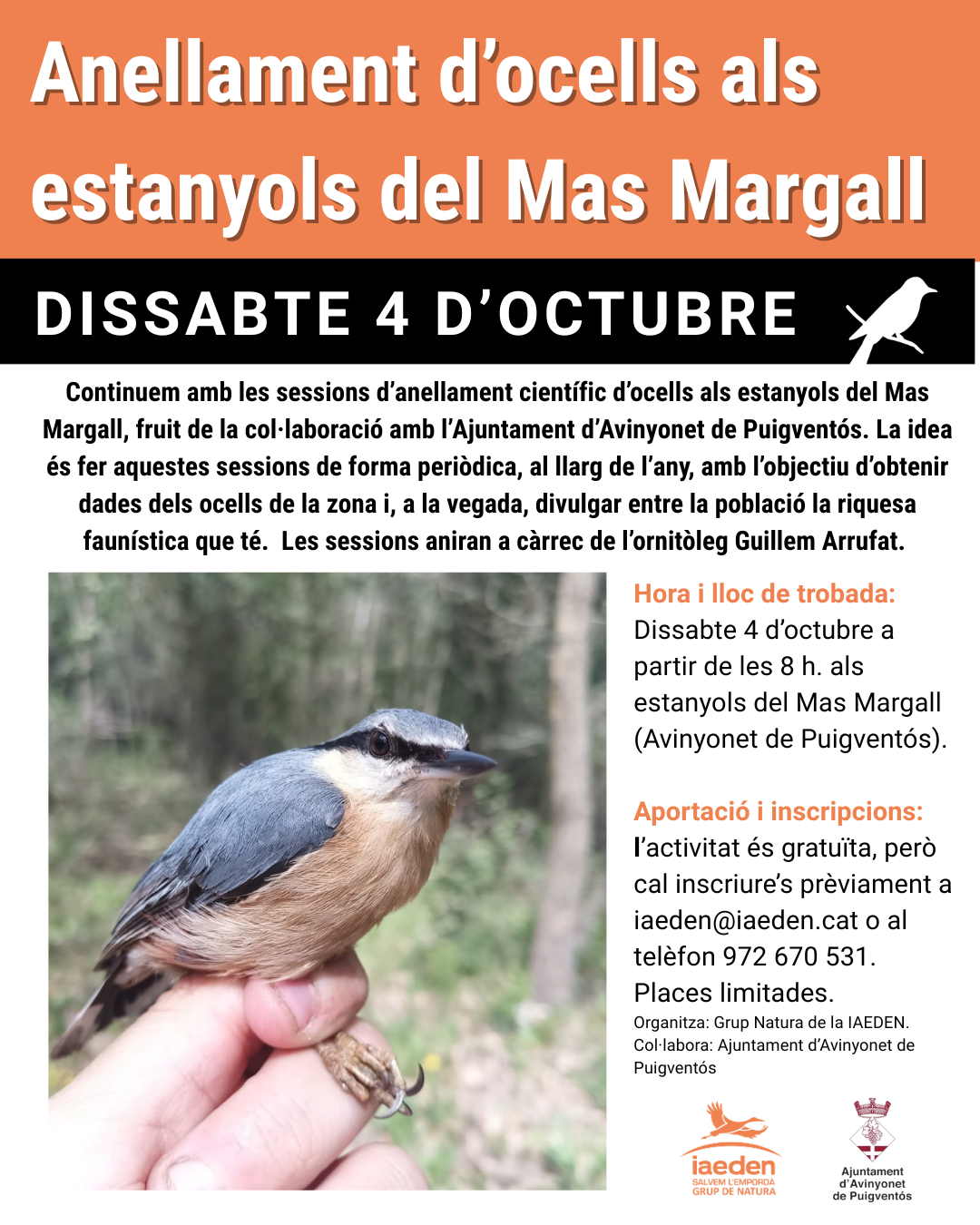 L'entitat naturalista organitzarà la tercera sessió d'anellament d'ocells del 2025 el dissabte 4 d'octubre, a partir de les 8h, als Estanyols de Mas Margall (Avinyonet de Puigventós). Aquestes sessions s'han dut a terme, amb la col·laboració de l'Ajuntament d'Avinyonet de Puigventós, de forma periòdica al llarg dels darrers anys. I es pretén continuar per tal d'obtenir dades dels ocells de la zona i divulgar a la població la riquesa faunística de l'espai natural.