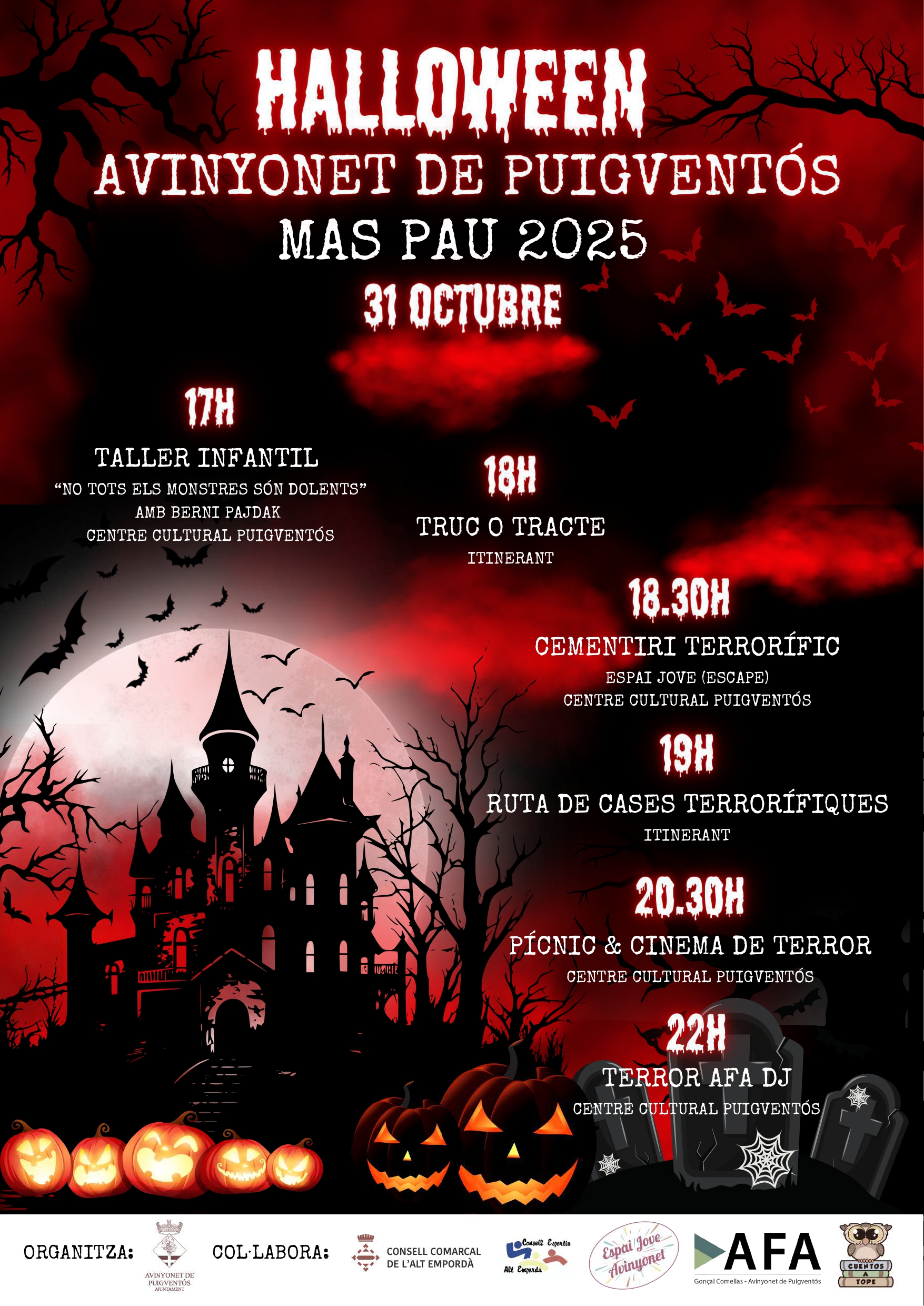 Us convidem a la Festa de Halloween 2025 d'Avinyonet de Puigventós que tindrà lloc el dijous 31 d'octubre al Centre Cultural Puigventós de Mas Pau.