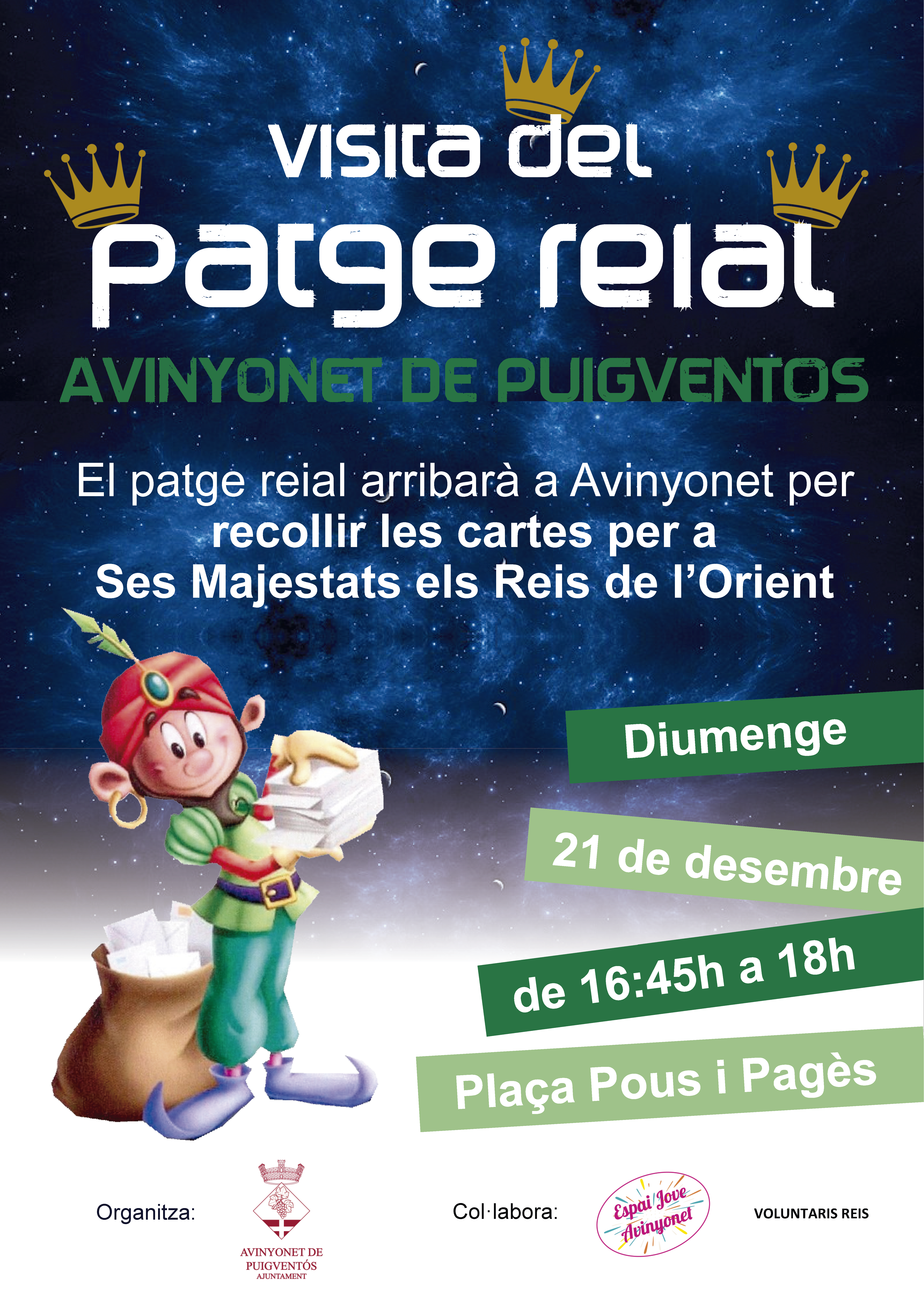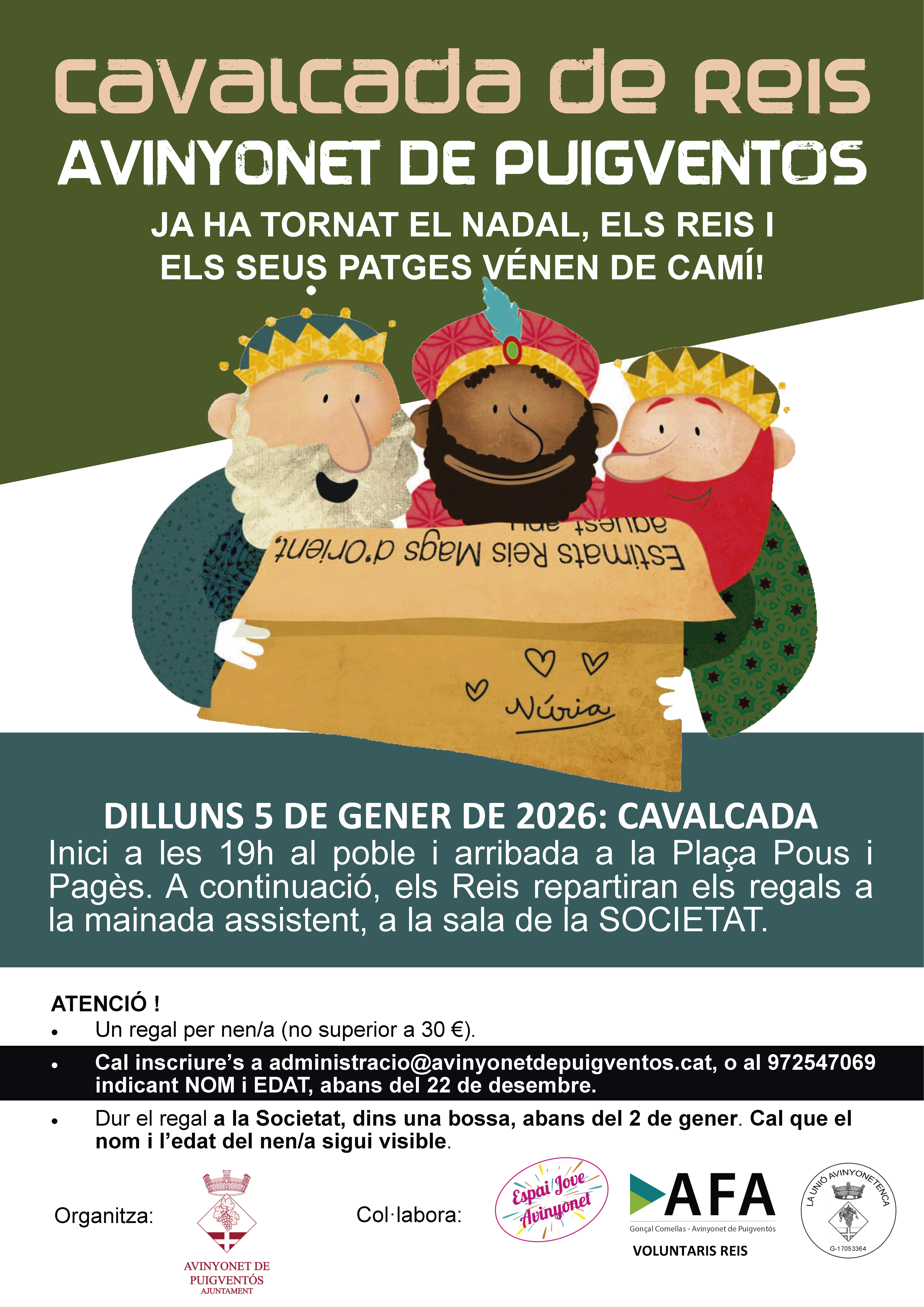 El dilluns 5 de gener de 2026, ses Majestats els Reis d’Orient arribaran a Avinyonet de Puigventós. La cavalcada s'iniciarà a les 19h al poble i arribarà a la Plaça Pous i Pagès. A continuació, els Reis repartiran els regals a la mainada assistent, a la sala de la SOCIETAT.