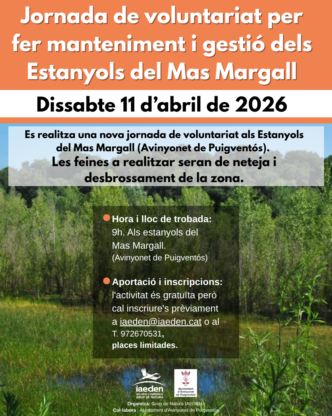 La IAEDEN-Salvem l'Empordà organitza una nova jornada de voluntariat als Estanyols del Mas Margall, al terme municipal d'Avinyonet de Puigventós, per a la neteja d’aguaits i desbrossament de la zona. Hora i lloc de trobada: a les 9 del matí als Estanyols.