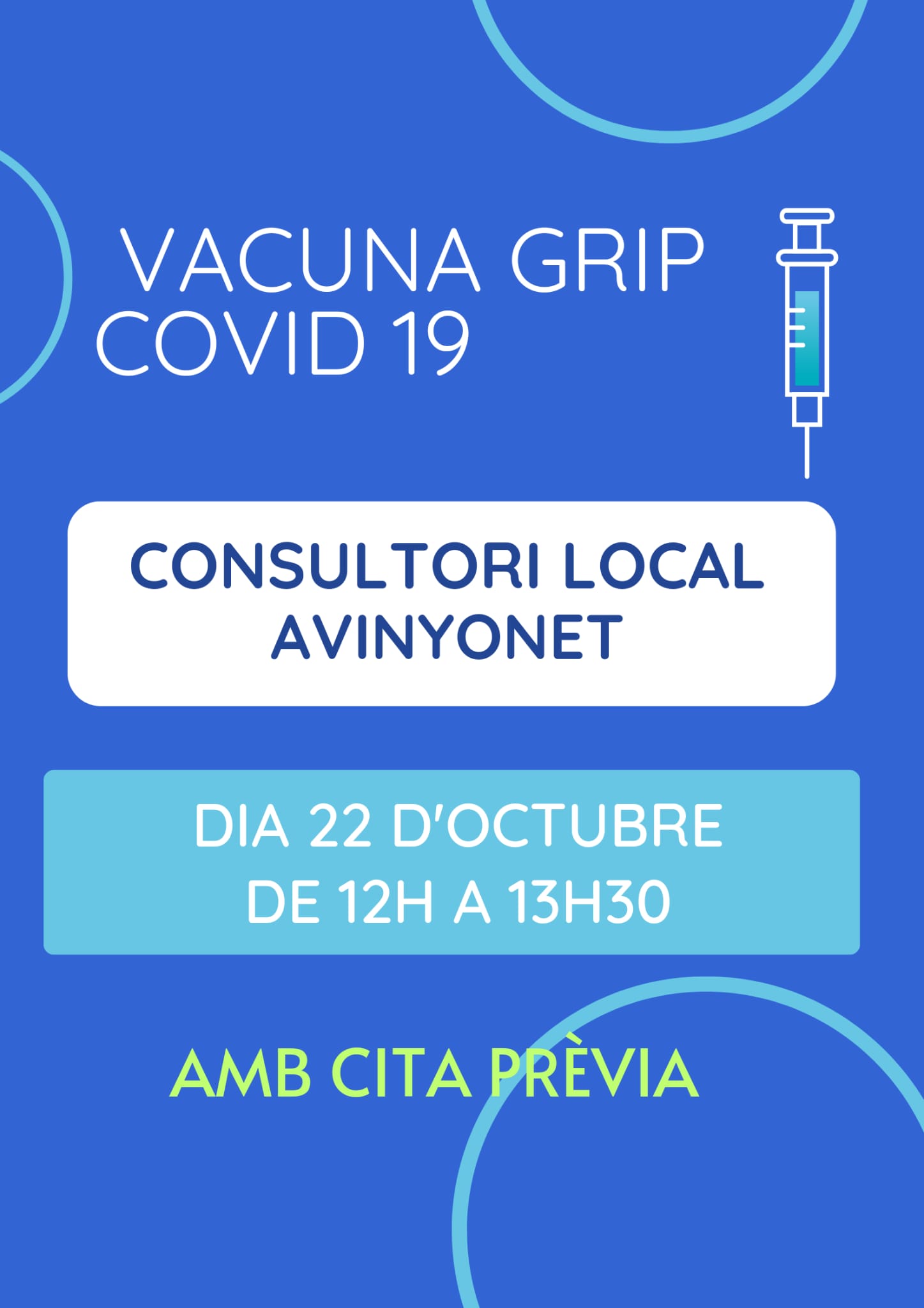 Aquesta tindrà lloc al consultori local d'Avinyonet de Puigventós, el dia 22 d'octubre, de 12.00 h a 13.30 h.
