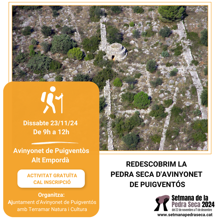 Us proposem una descoberta guiada del patrimoni de la pedra seca a Avinyonet de Puigventós amb l'activitat "Redescobrim la Pedra Seca d'Avinyonet de Puigventós". Aquesta serà una ruta guiada pels entorns d'Avinyonet de Puigventós per redescobrir les barraques i altres elements de la pedra seca del nostre municipi.