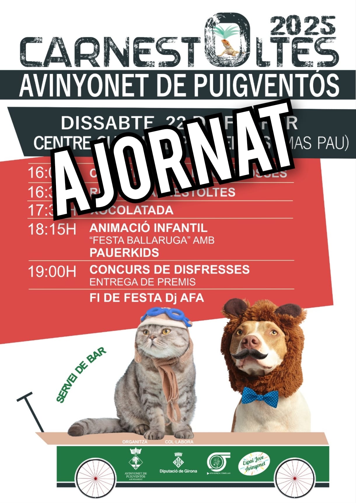 Per predicció meteorològica, la Festa de Carnestoltes, prevista pel dissabte, 22 de febrer, queda AJORNADA.