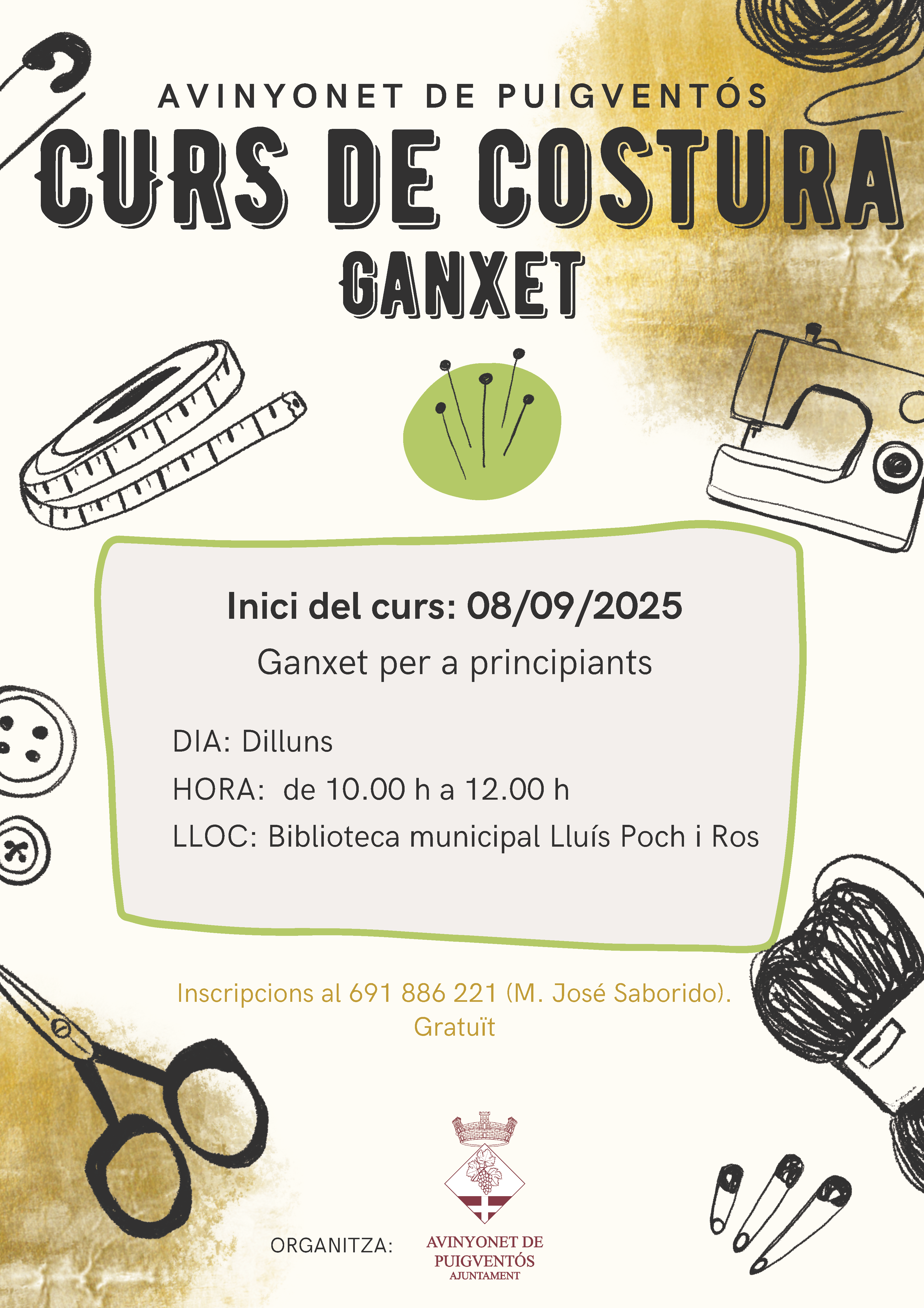 Us informem que, a partir del dilluns 8 de setembre, començarà un nou curs de costura (ganxet). Les classes s'impartiran a la biblioteca municipal Lluís Poch i Ros, els dilluns, de 10.00 h a 12.00 h.