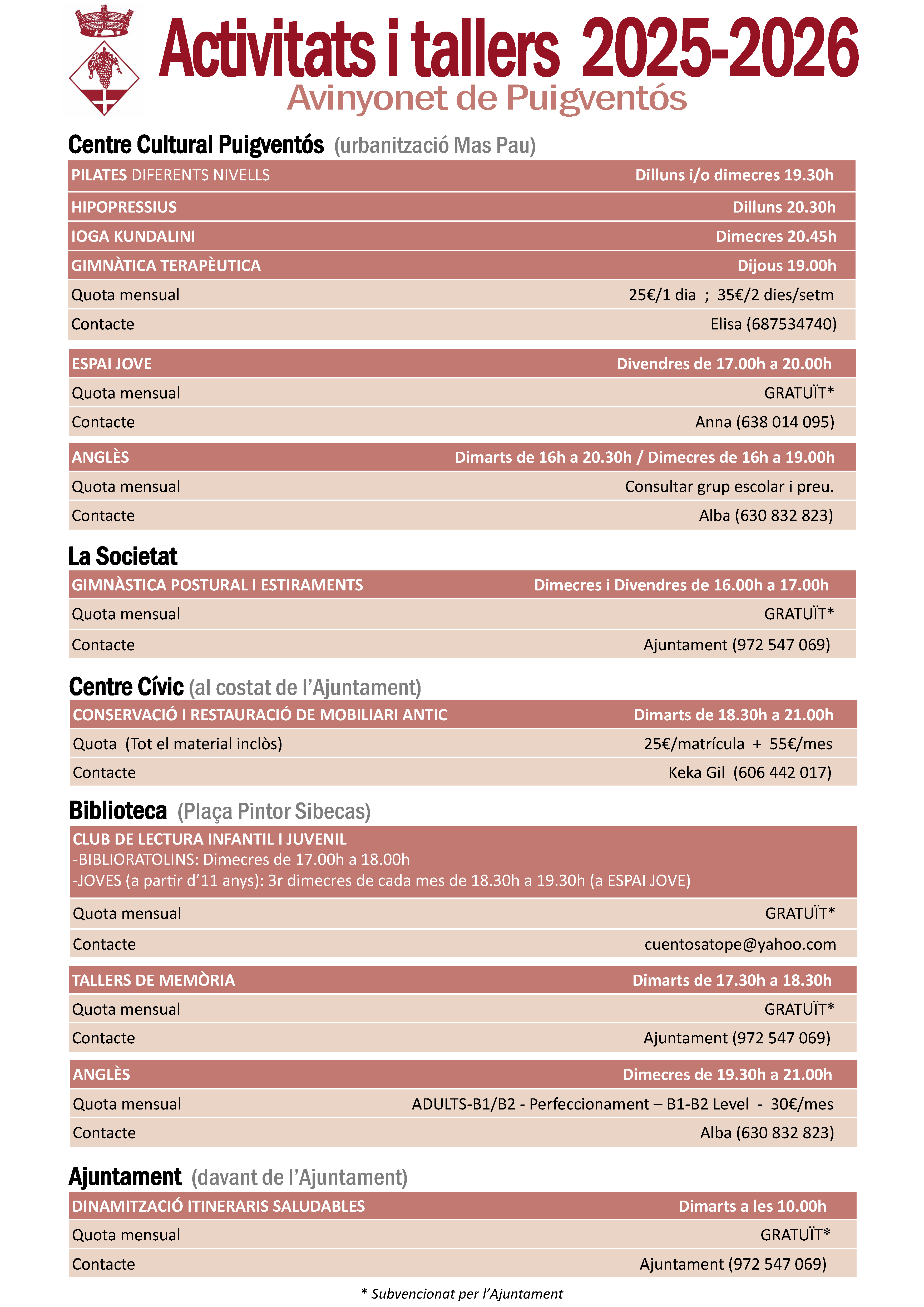 Oferta d'activitats i tallers a Avinyonet de Puigventós 2025-2026