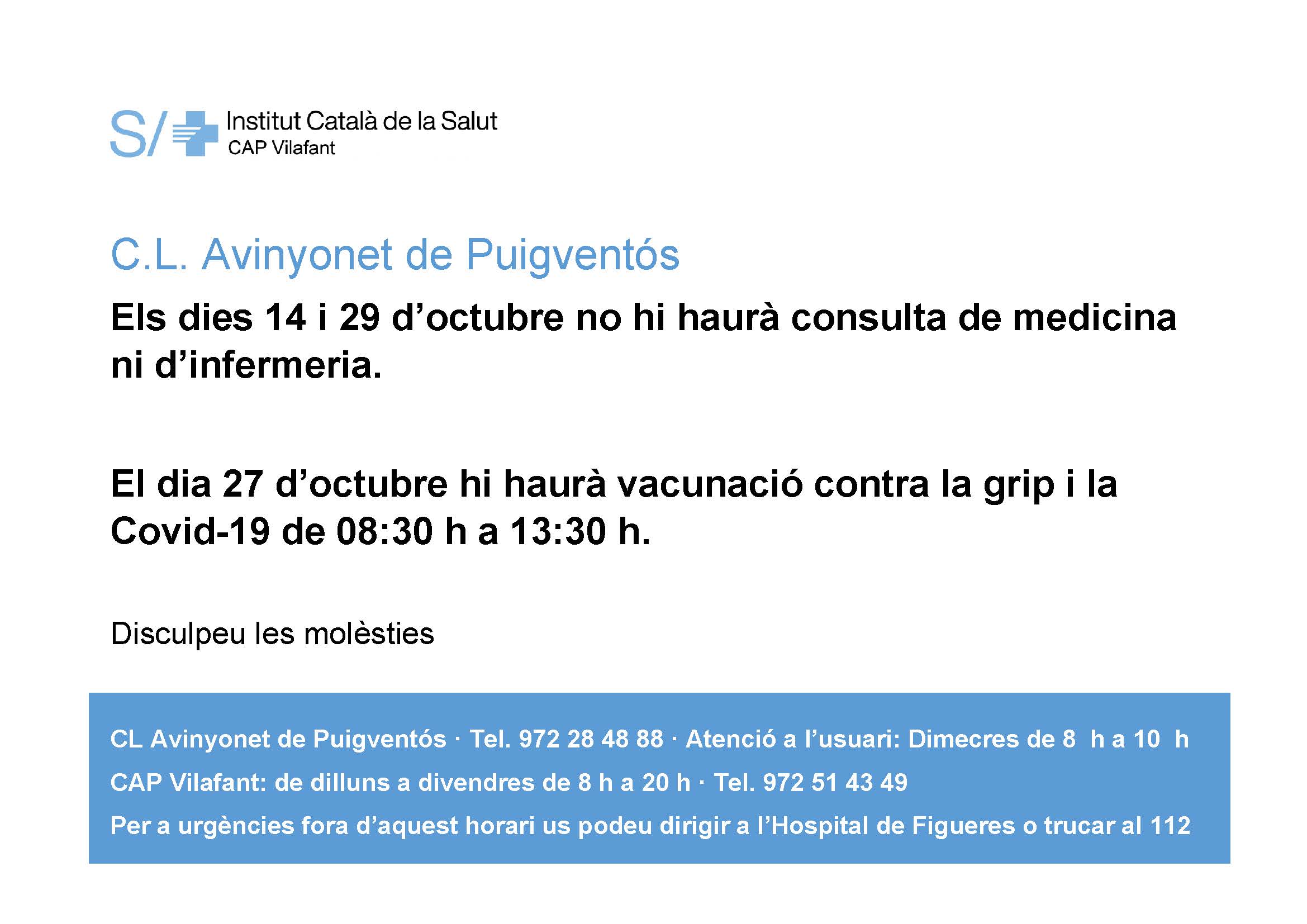 Canvi d'horari en les consultes d'infermeria i medicina del consultori local d’Avinyonet de Puigventós.