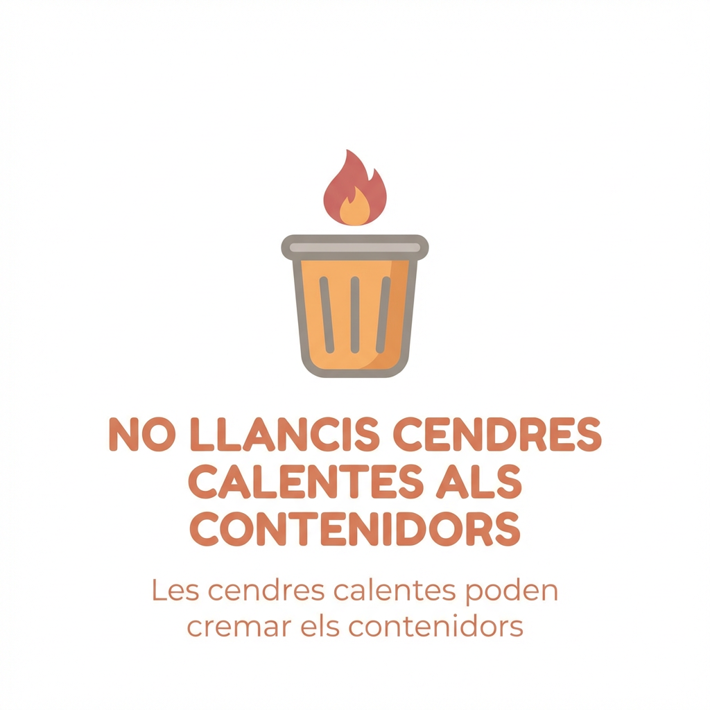 Recorda: mai s'han de llençar les cendres calentes al contenidor. Un petit caliu pot encendre la brossa i cremar tot el contenidor, generant perill i un cost innecessari.