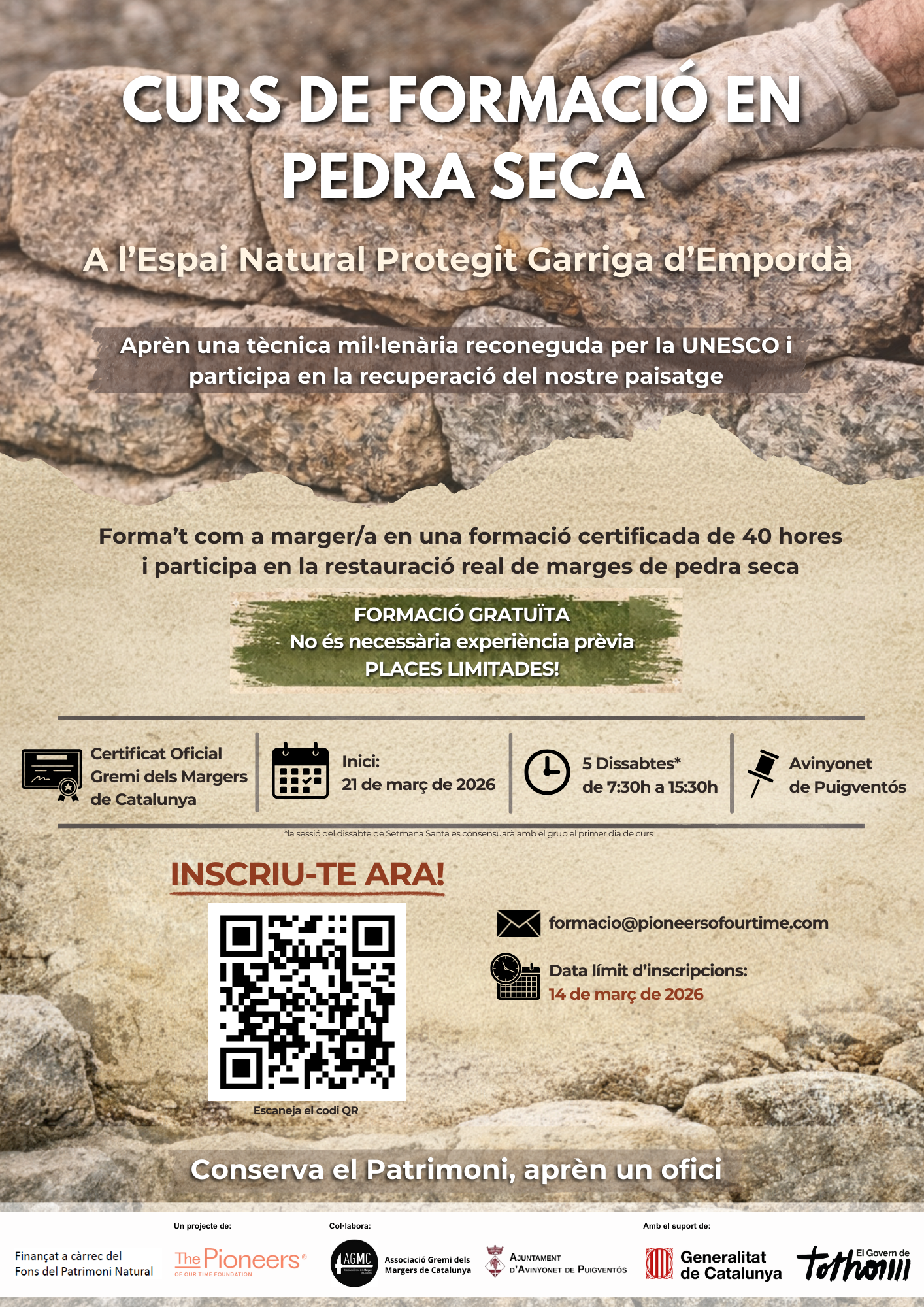 Vols aprendre una tècnica mil·lenària reconeguda per la UNESCO i participar en la recuperació del nostre paisatge, a l'Espai Natural Protegit de la Garriga d'Empordà? Forma't com a marger/a en una formació certificada de 40 hores i participa en la restauració real de marges de pedra seca.