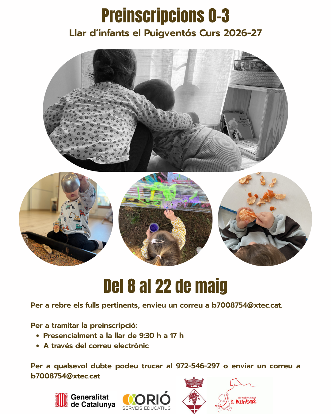 El període de preinscripció Llar d'infants "El Puigventós" 2026-2027 serà del 8 al 22 de maig.